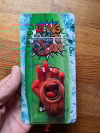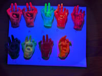 THE KUNG FU CLAW stands just under 3 inches and is made of keshi-like rubber. They are hand cast by the Cheese Master in marbled day-glo uv colors and some gid stuff.